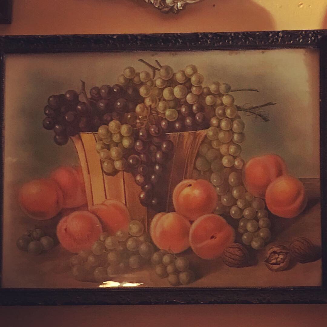I make small adjustments here and there but it seems to have arrived at what I’ve been going for. It’s a collection of meaningful images and objects. Two mirrors, three clocks, a shadow box with memories of my mother’s life, a hanging candle holder that reminds me of a censer from a Serbian/Greek Orthodox Church in Los Angeles. The centerpiece of the grouping depicts an abundance of harvested fruit once belonging to a great grandmother I’d never met. Grandma Cary hung this in her home for years and wrote an inscription to me on the back in her own handwriting making it even more dear.