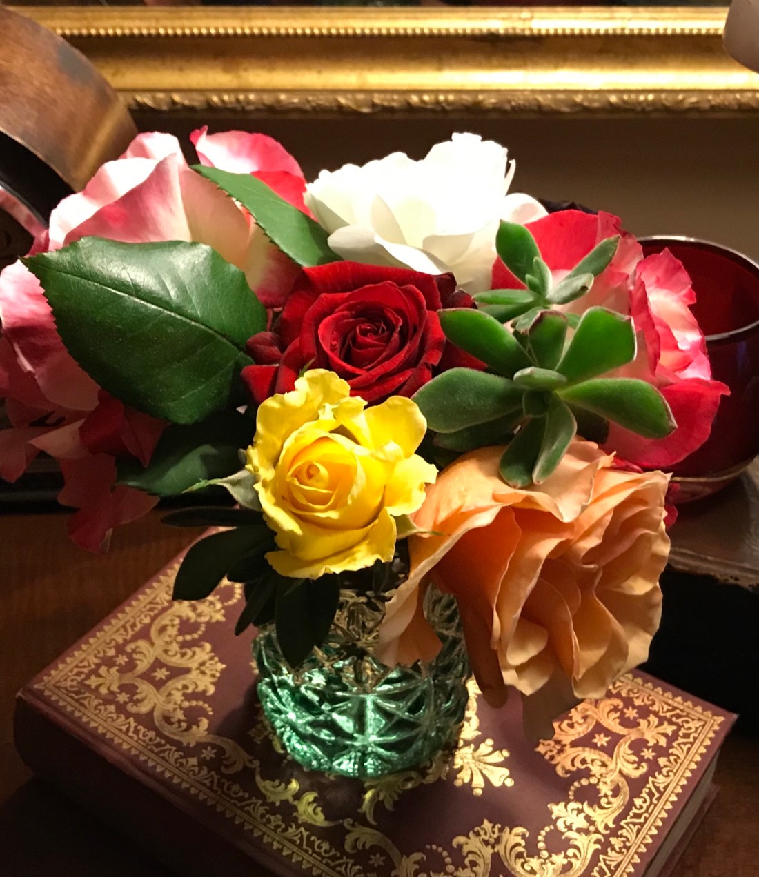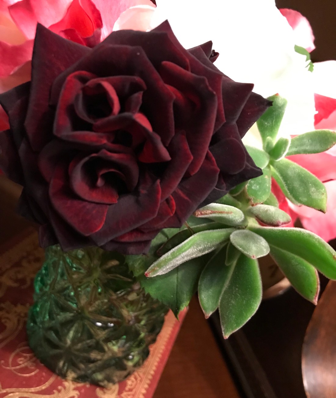 The dark rose is my favorite though not visible from this angle. She appears in somber solitude and seems to prefer to stand alone. But, by the estimation of an all-knowing Gardener, is best appreciated when arranged next to a sunny yellow companion and even such an unlikely partner as the succulent. The contrast itself reveals unique qualities otherwise unregarded.