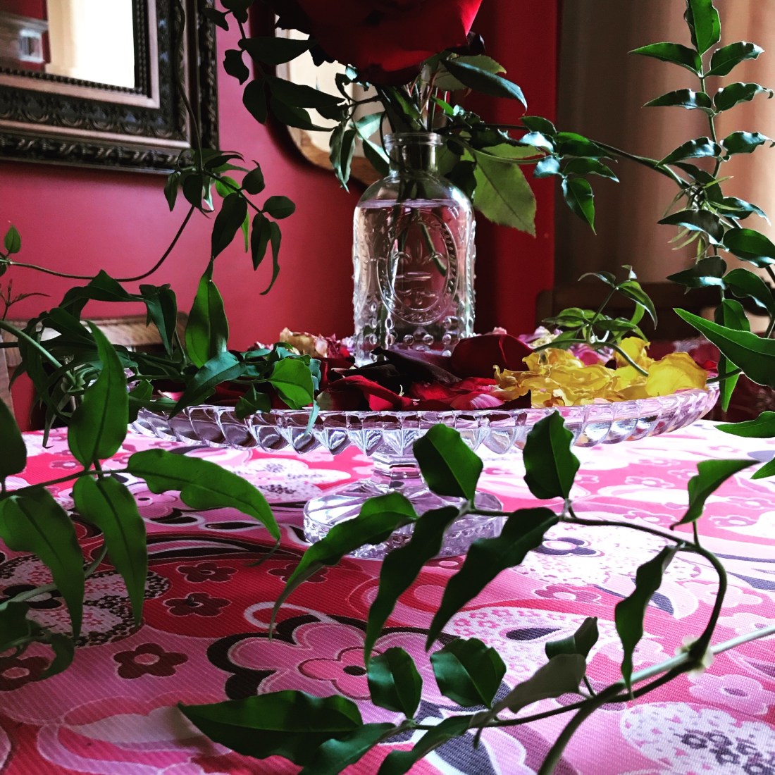 Recently, when cutting a couple roses for an arrangement on the dining table, I decided to also bring in the three foot strand of honeysuckle that had twined around one of the rose’s stems. This photo is the result of that and it comes with this encouragement: “bring it inside.”