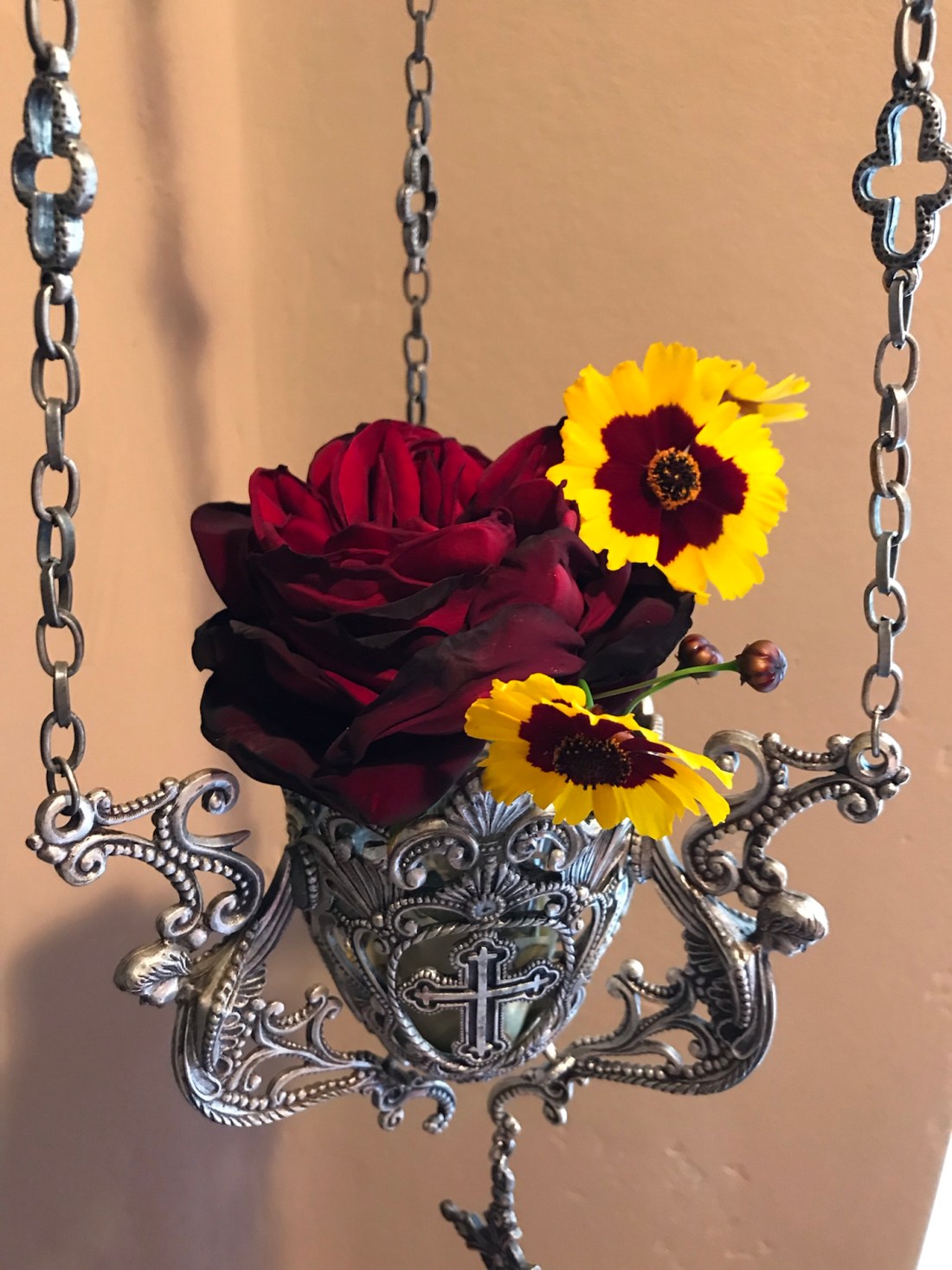 To commemorate the experience I chose to picture a rose from my garden with the happiest little yellow flower. I have no idea what its called and would love to know the name of this cheery little friend with the deep red center. It was growing in a narrow patch of dry dirt at the entrance of the repair shop.