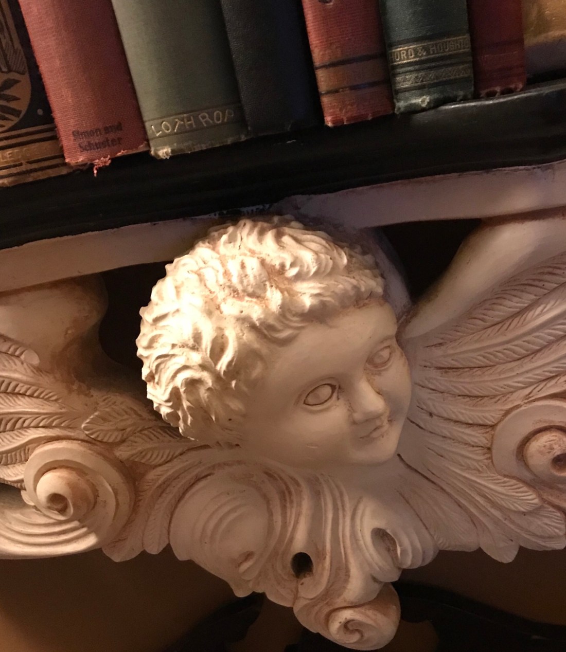 The sturdy wall bracket, fashioned to resemble a cherub with outstretched and feathered wings, supports a small collection of my vintage books. Its super sturdy. The handyman who hung it for me said I could do pull-ups on it, he had secured it to the wall so very well. I liked that. Its a heavy piece so having it installed properly was an original concern.