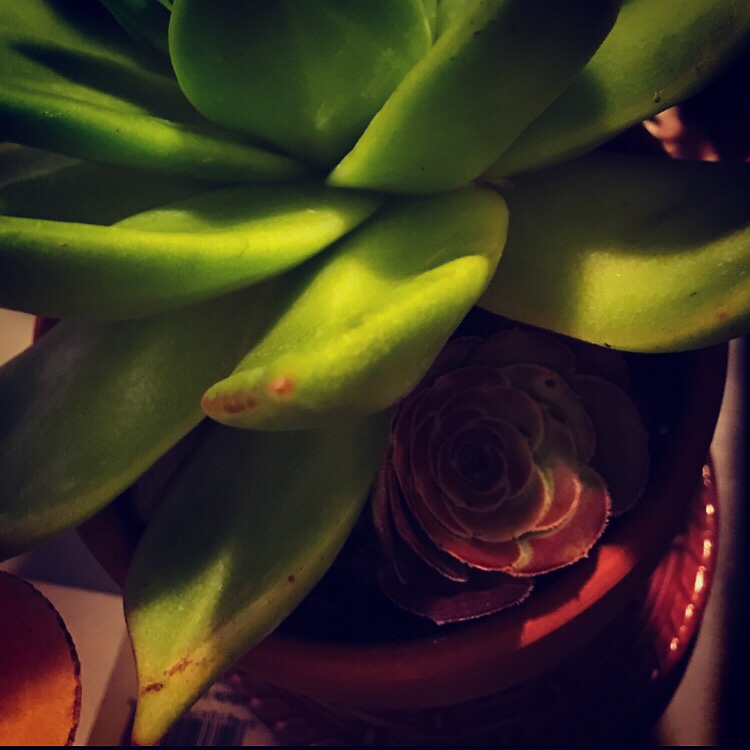 That little reddish rosette of a succulent plant is happy there, tucked under the shadow of the wing of its protector.