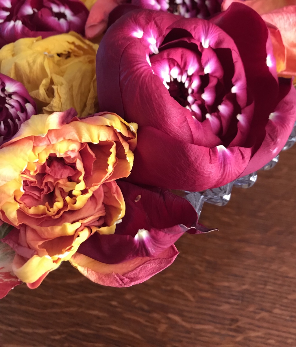 These colorful blooms are week old roses. Softened just enough to have their stem and rosehead pulled away, leaving the petals intact. They of course won’t last long after having their core and lifeline removed. But in this moment they are beautiful, having been transformed into a unique looking species. In reality they are common garden roses.