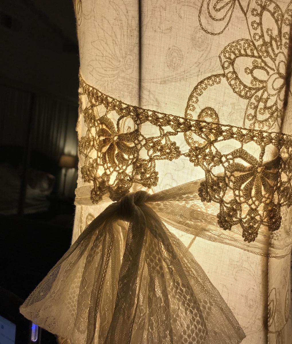 Grandma’s hand worked lace went out of fashion multiple decades ago. It has a new life now as a lampshade adornment that I enjoy—not a use she would have foreseen for this collar made to embellish the neckline of an otherwise plain country dress.
