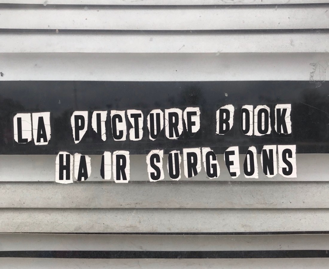 We were looking up as we walked along the crumbling sidewalk of oldtown Palestine, east Texas. Way above our heads we saw the year 1878 posted high up on the Victorian ornamented peak of the period wooden building. That’s when I spotted the hanging sign with the curious title in a lovely french inspired script. “LA Picture Book Hair Surgeons.”